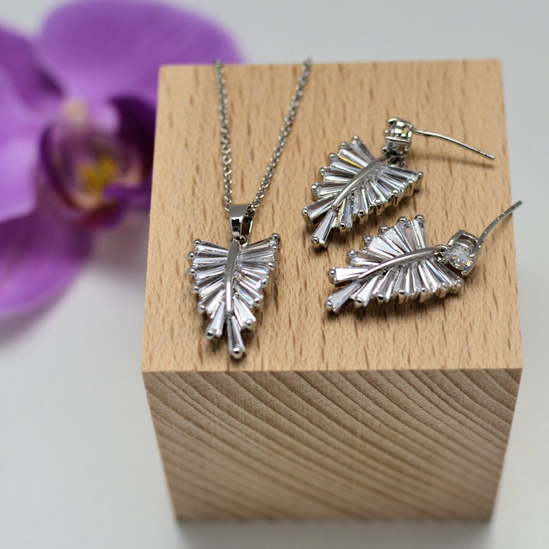 Colierul, cu un pandantiv delicat și rafinat, este împodobit cu pietre prețioase de zirconiu, care reflectă lumina într-un dans sublim de sclipiri. Cerceii asortați completează perfect ansamblul, aducând un echilibru perfect între strălucirea discretă și rafinamentul sofisticat.
