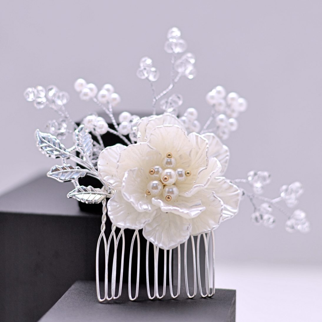 O bijuterie delicată pentru păr. Floarea de un alb perlat emană eleganță, iar perluțele delicate împodobesc crenguțele, adăugând un aer de rafinament.