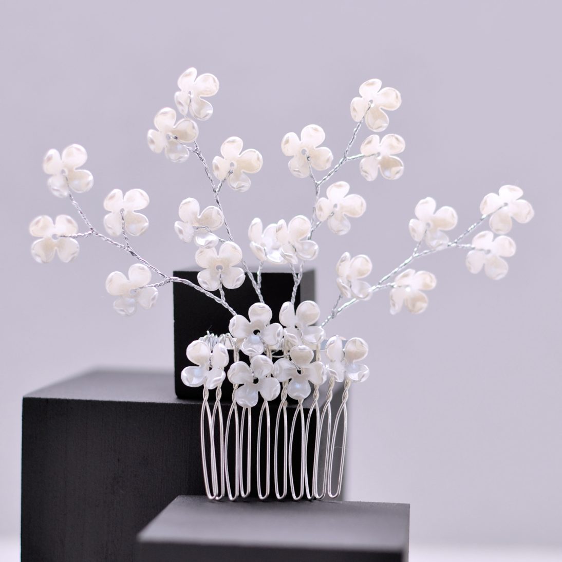 O bijuterie delicată pentru păr. Floricelele albe emană eleganță și împodobesc delicat crenguțele, adăugând un aer de rafinament.