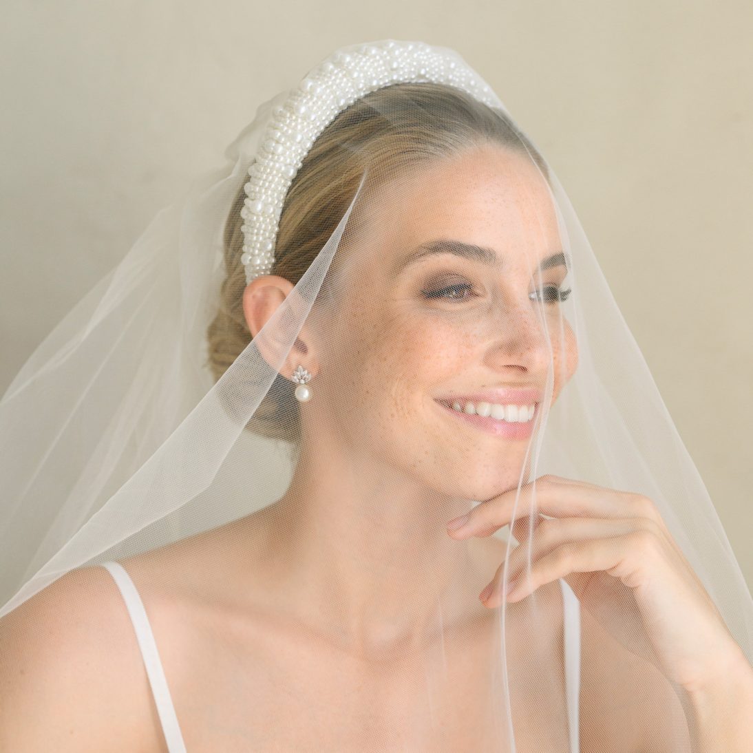 O bentită fermecătoare, confecționată din perle ivoire, care aduce un aer rafinat coafurii miresei.