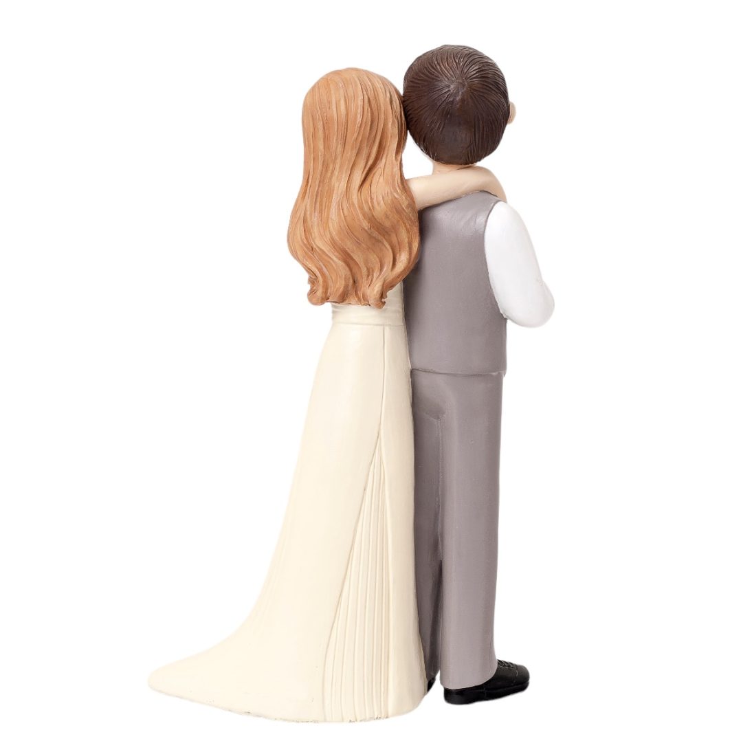 Această figurină emoționantă redă mireasa îmbrățișându-l pe mire cu tandrețe, ținându-și buchetul în mână, în timp ce el o privește cu adâncime și iubire peste umăr.