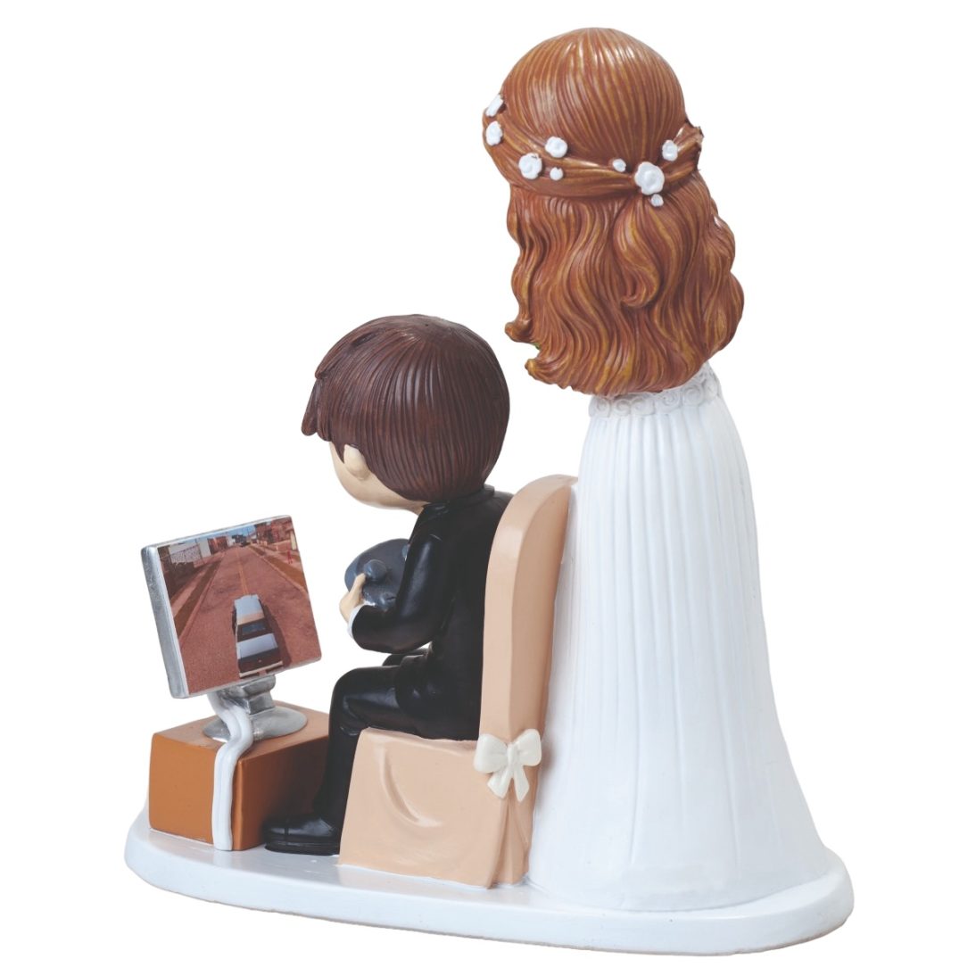 Această figurină surprinde un mire așezat pe un fotoliu, concentrat și atent la un joc pe o consolă de gaming. În spatele fotoliului, mireasa stă enervată, așteptând plecarea la nuntă, în timp ce el continuă să se joace.