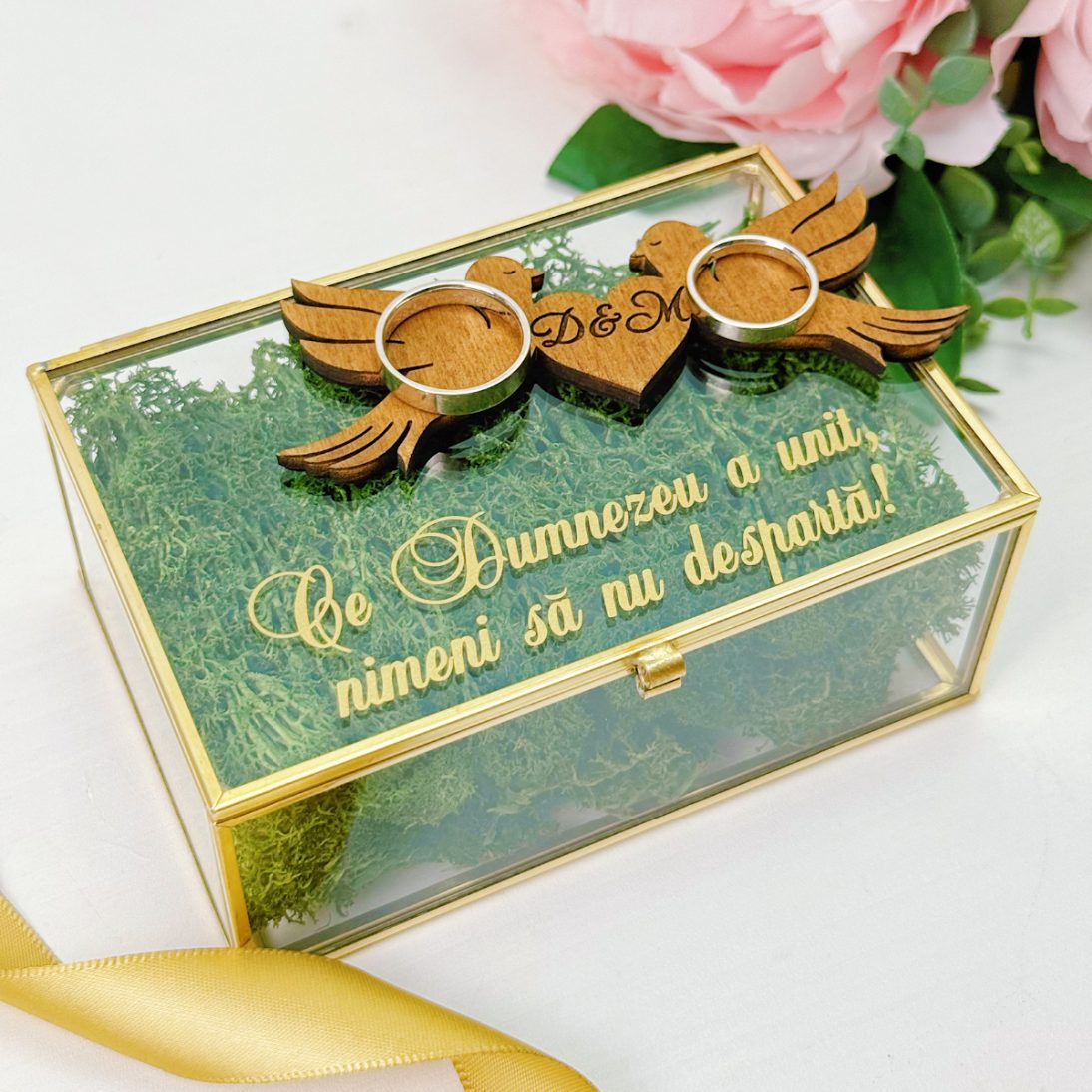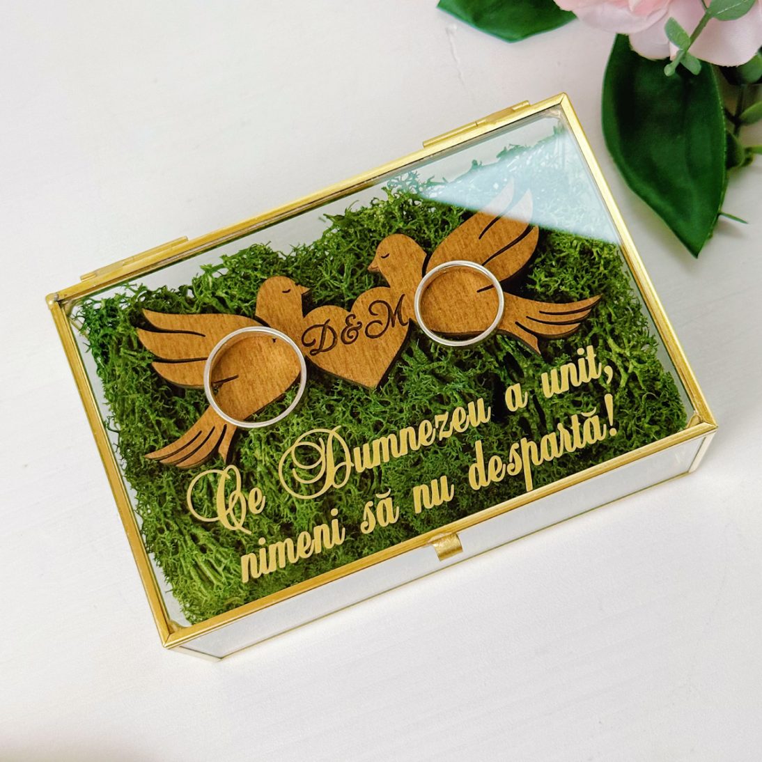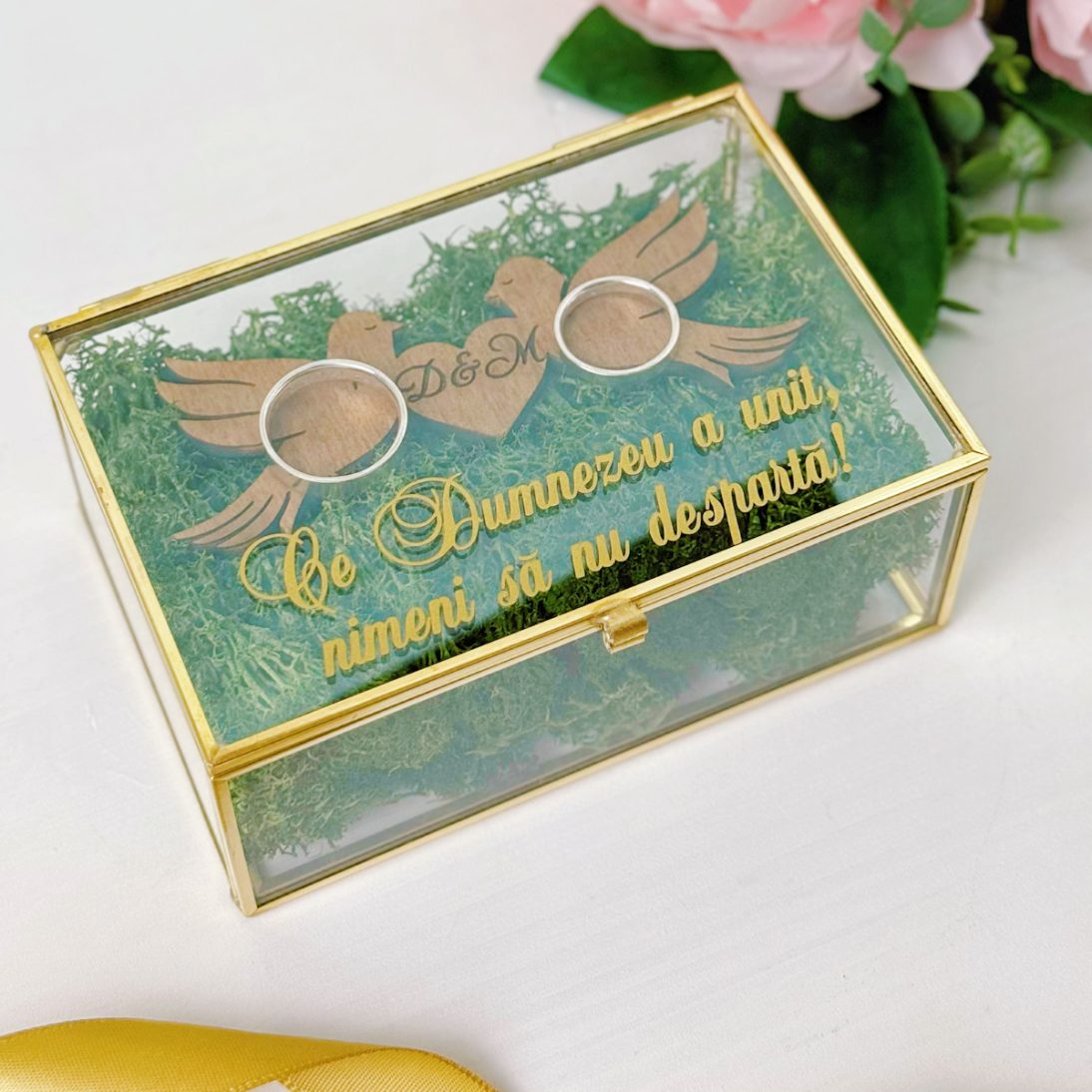 În ziua nunții ele pot fi puse în valoare într-o cutie specială pentru verighete confecționată cu atenție la detalii și dăruire.