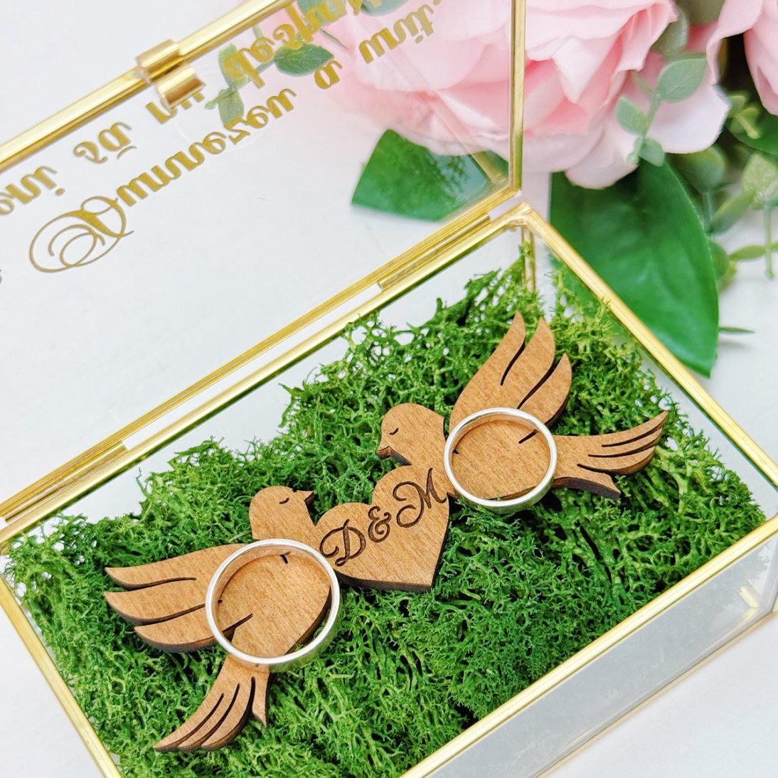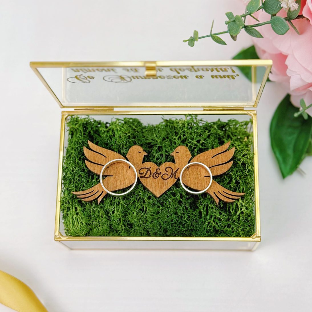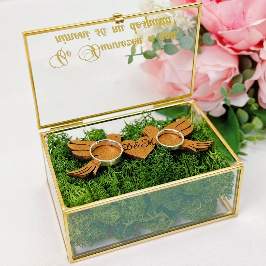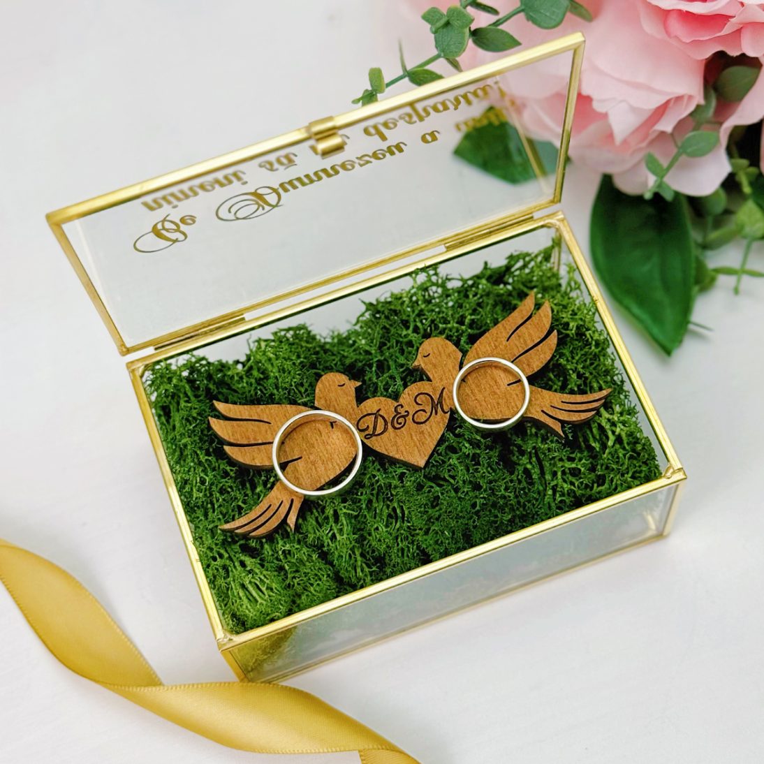 În ziua nunții ele pot fi puse în valoare într-o cutie specială pentru verighete confecționată cu atenție la detalii și dăruire.