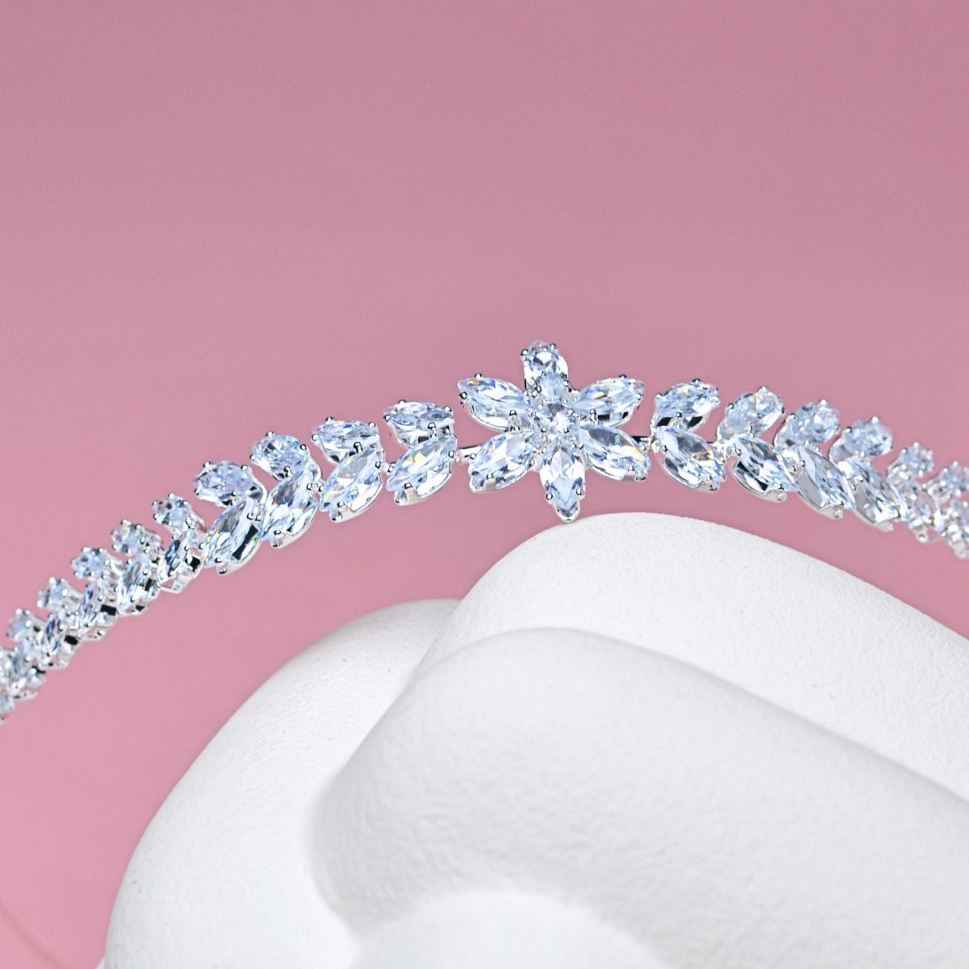 Această coroniță reprezintă o alegere rafinată pentru miresele moderne, aducând o notă subtilă de strălucire. Cu designul său sofisticat, se fixează ușor în păr cu ajutorul agrafelor, completând cu grație coafura miresei pentru un aspect desăvârșit.