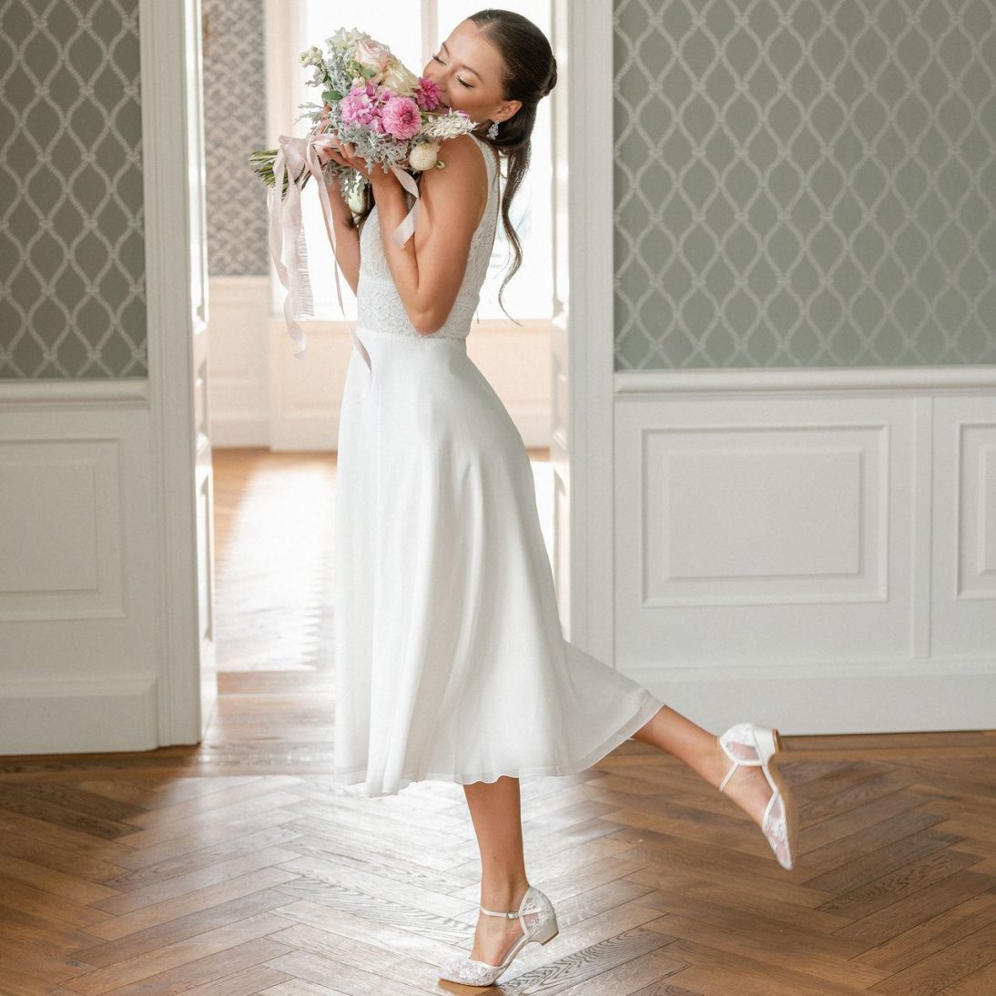 Estella este o pereche de pantofi pentru nuntă cu adevărat specială, realizată manual cu dantelă semi-transparentă, inspirată din modelul de succes Miriam. Acești pantofi sunt o alegere perfectă pentru miresele care nu pot purta tocuri înalte sau pentru cele care doresc să se bucure de confortul maxim pe tot parcursul evenimentului.