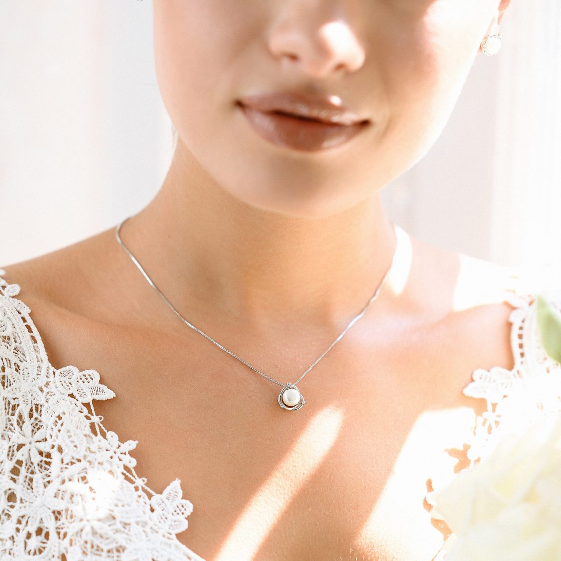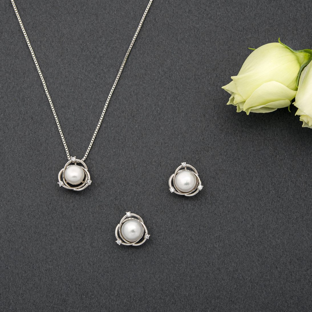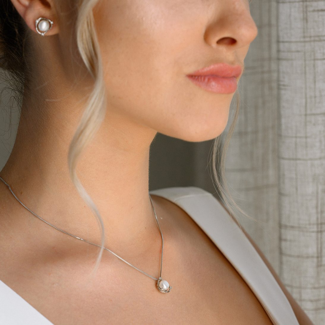 Colierul, cu un pandantiv delicat și rafinat, este împodobit cu o perlă și cristale prețioase din zirconiu cubic, care reflectă lumina într-un dans sublim de sclipiri. Cerceii asortați completează perfect ansamblul, aducând un echilibru perfect între strălucirea discretă și rafinamentul sofisticat.