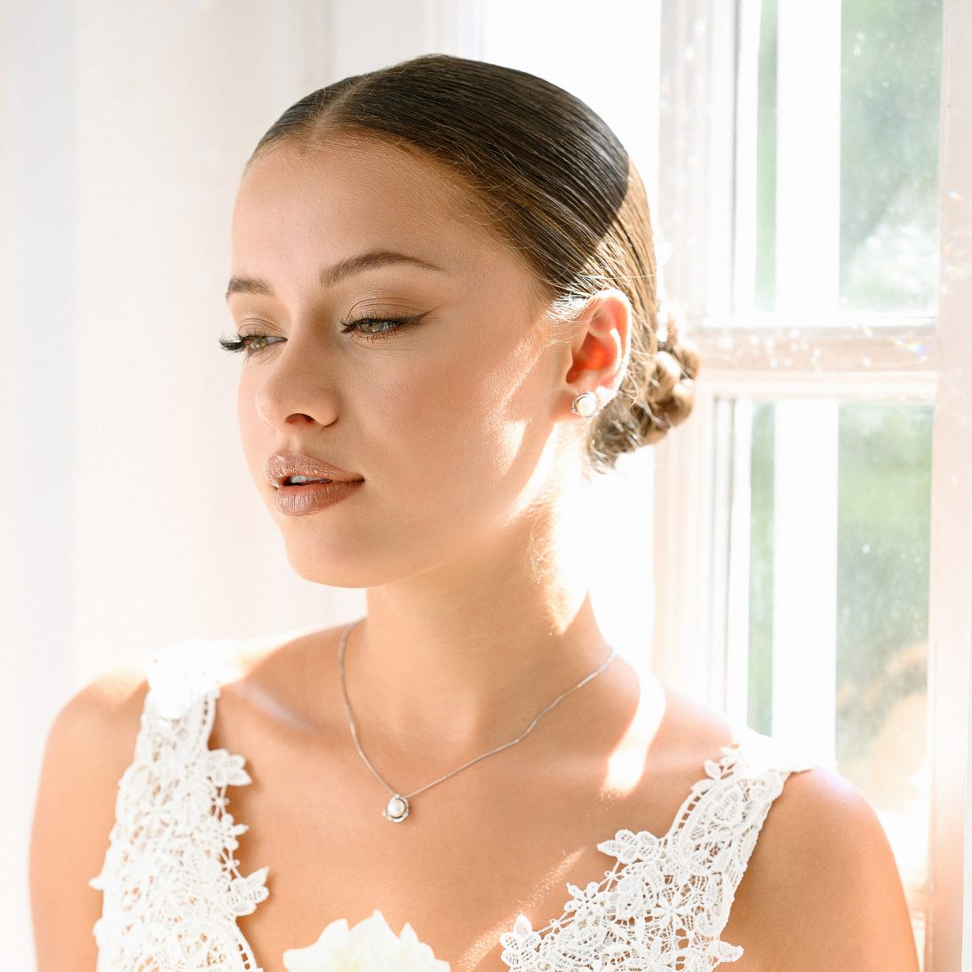 Acest set evidențiază cu subtilitate frumusețea naturală a miresei, aducând o notă elegantă în ziua cea mare. Este alegerea ideală pentru o mireasă care apreciază eleganța atemporală și strălucirea discretă.