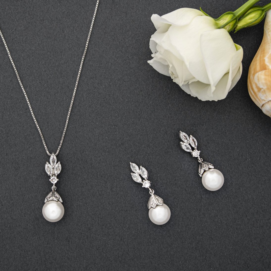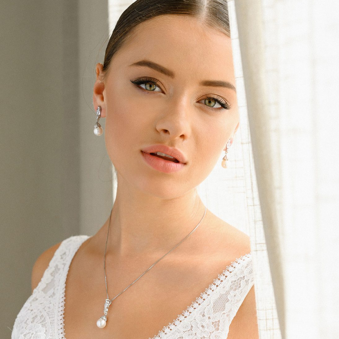 Colierul, cu un pandantiv delicat și rafinat, este împodobit cu o perlă finisată manual și cristale prețioase din zirconiu cubic, care reflectă lumina într-un dans sublim de sclipiri. Cerceii asortați completează perfect ansamblul, aducând un echilibru perfect între strălucirea discretă și rafinamentul sofisticat.