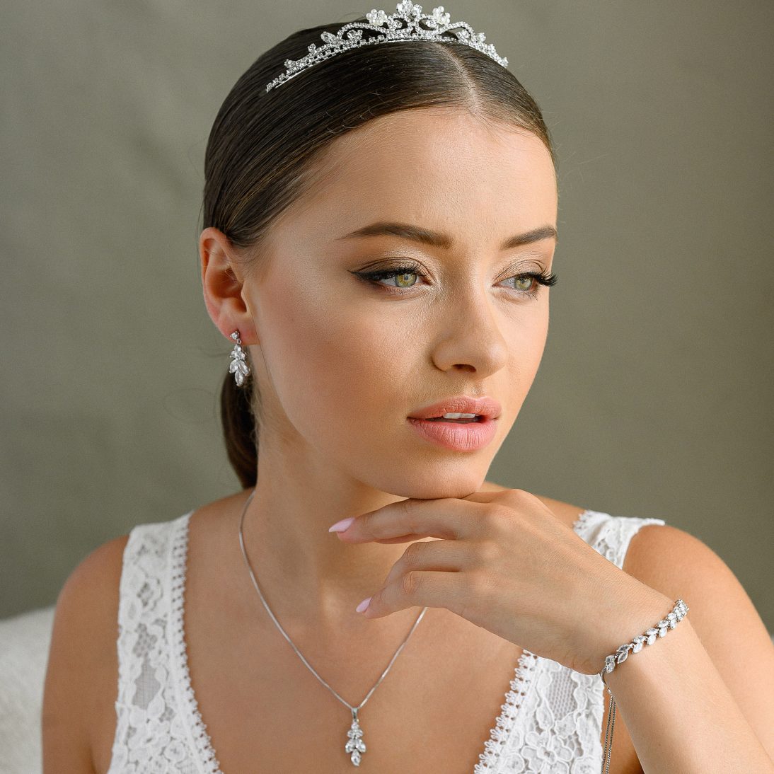 Acest set evidențiază cu subtilitate frumusețea naturală a miresei, aducând o notă elegantă în ziua cea mare. Este alegerea ideală pentru o mireasă care apreciază eleganța atemporală și strălucirea discretă.