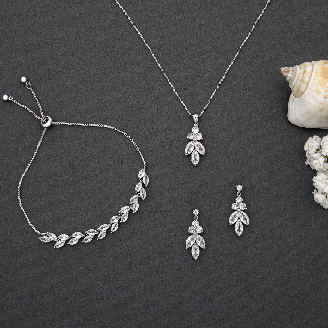 Colierul și brățara sunt împodobite cu pietre prețioase din zirconiu cubic și reflectă lumina într-un dans sublim de sclipiri. Cerceii asortați completează perfect ansamblul, aducând un echilibru perfect între strălucirea discretă și rafinamentul sofisticat.