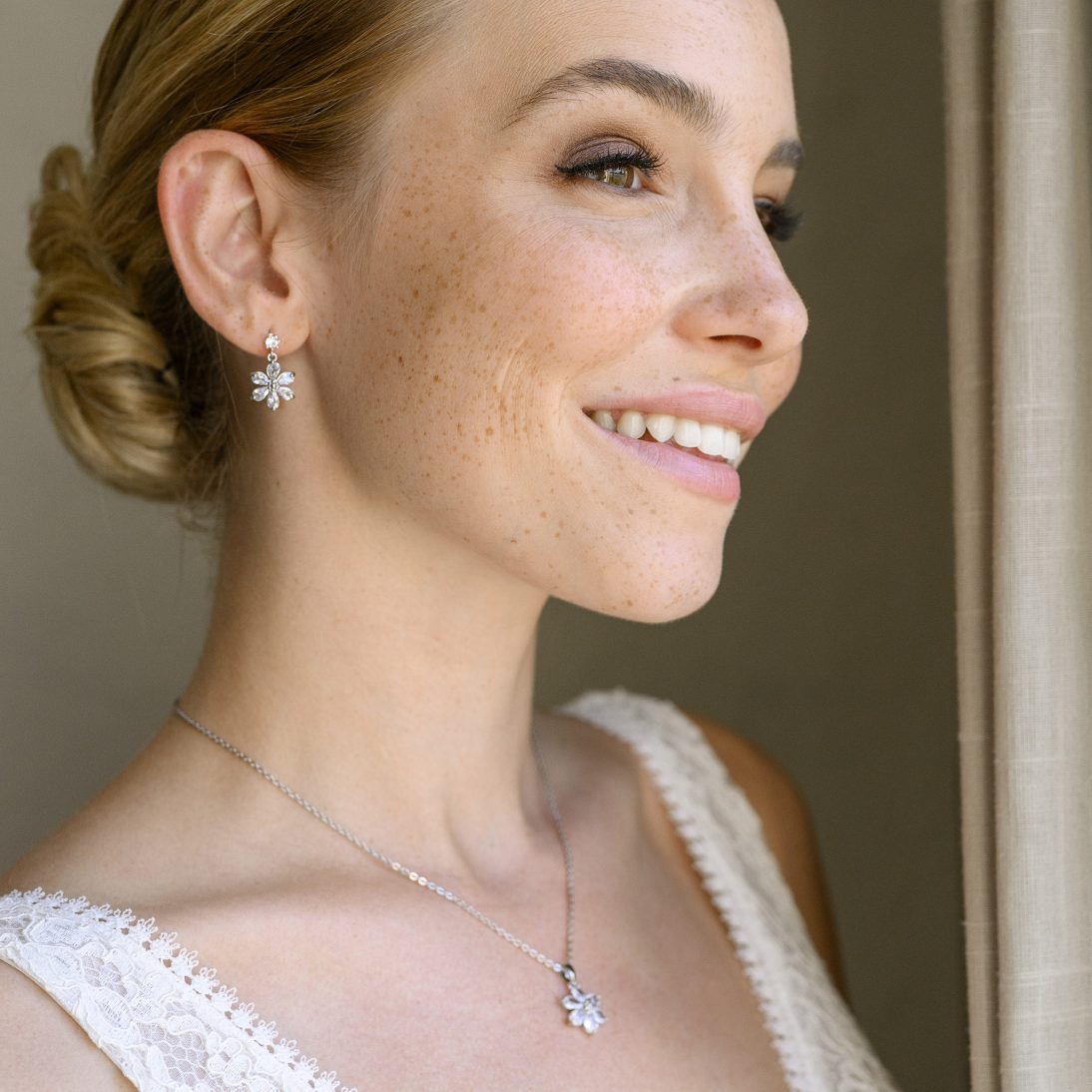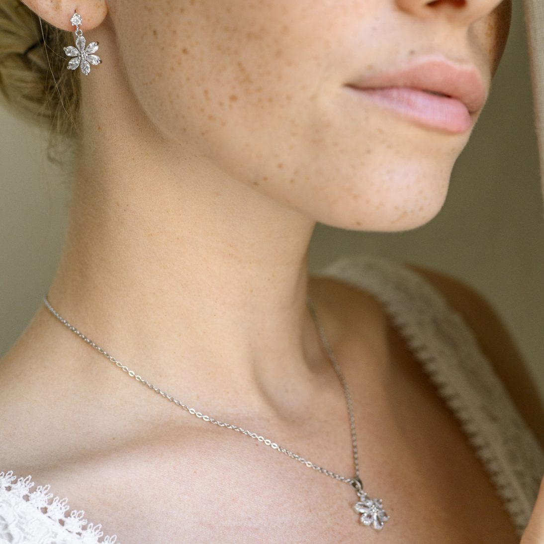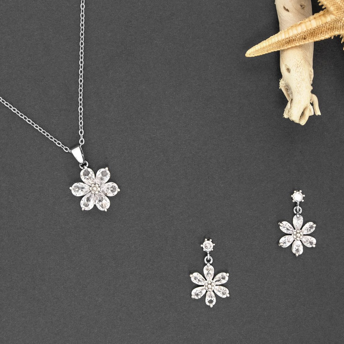 Colierul, cu un pandantiv delicat și rafinat, este împodobit cu cristale prețioase din zirconiu cubic, care reflectă lumina într-un dans sublim de sclipiri. Cerceii asortați completează perfect ansamblul, aducând un echilibru perfect între strălucirea discretă și rafinamentul sofisticat.