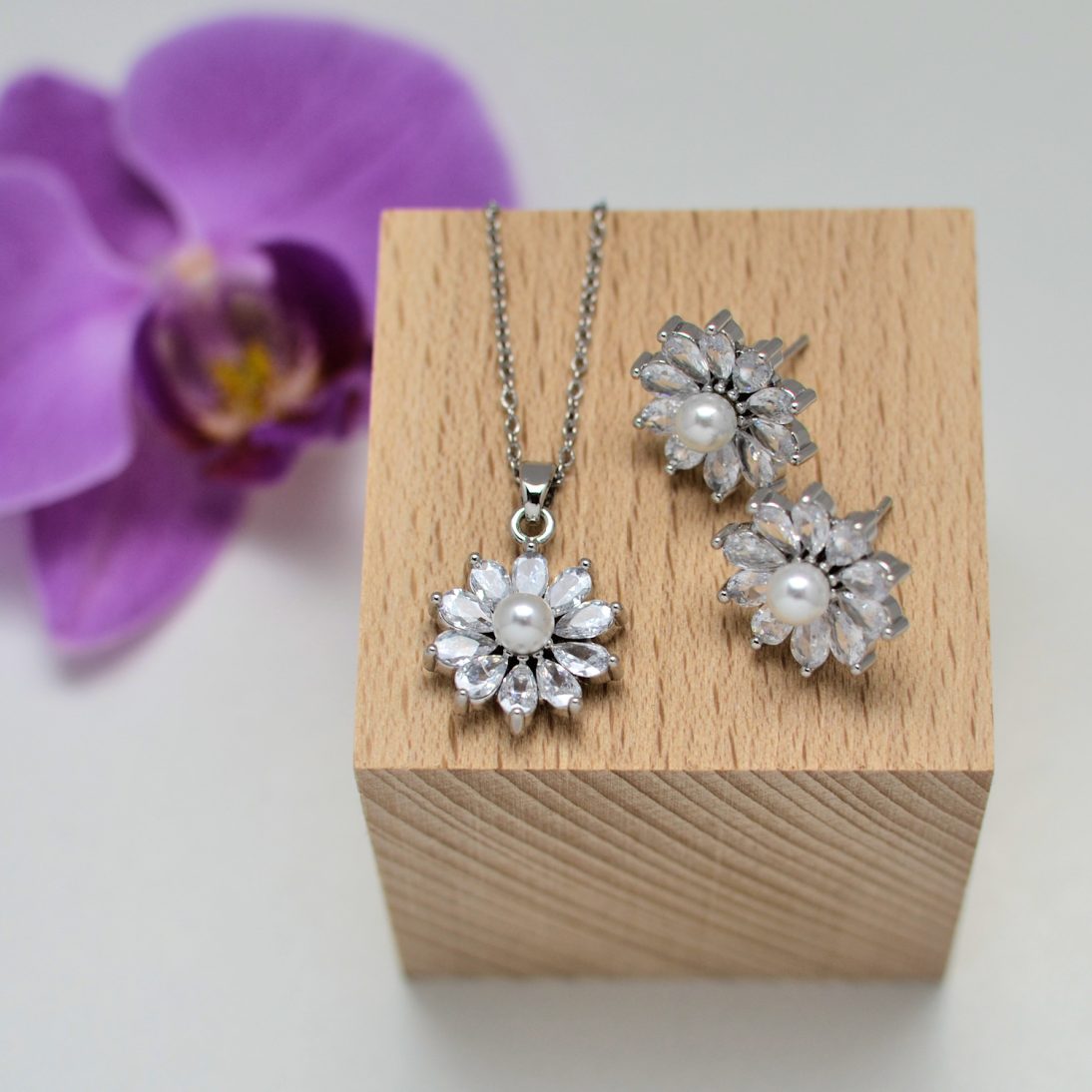 Fiecare detaliu strălucește în lumină, creând un ansamblu de accesorii ce transformă momentul într-un tablou romantic. Setul este alegerea perfectă pentru o mireasă care caută un echilibru subtil între tradiție și modernitate, îmbrățișând frumusețea eternă a perlelor și strălucirea discretă a cristalelor de sticlă.