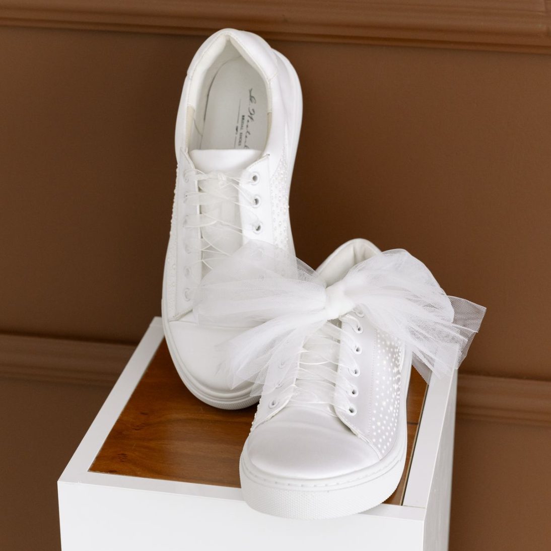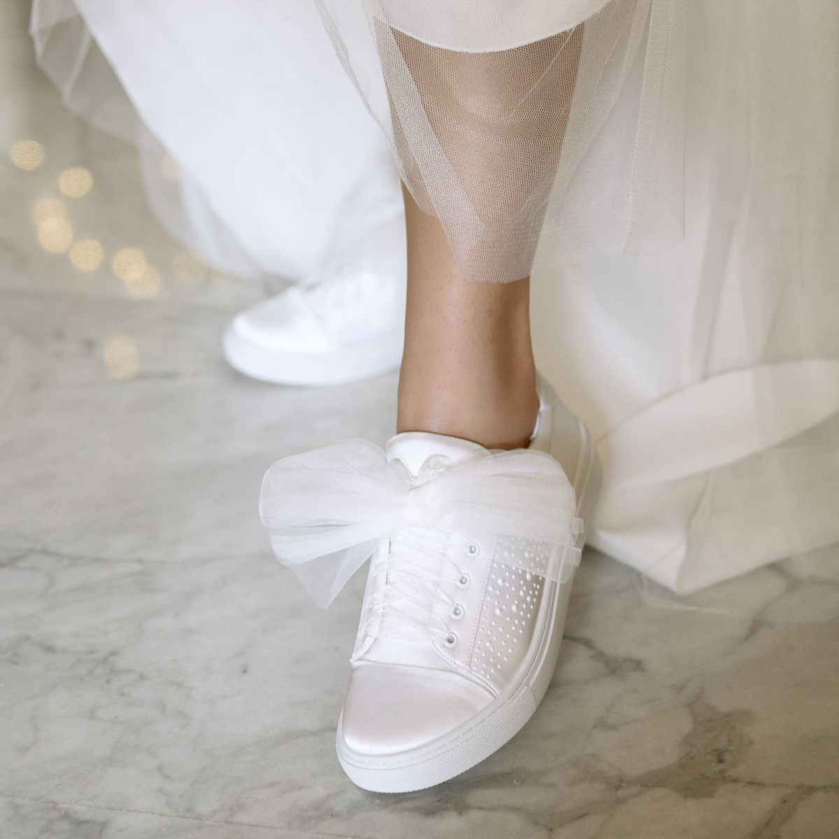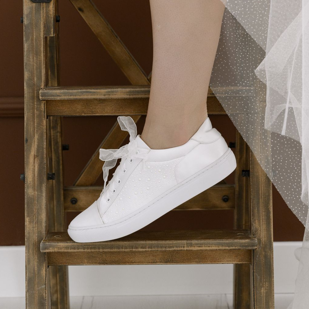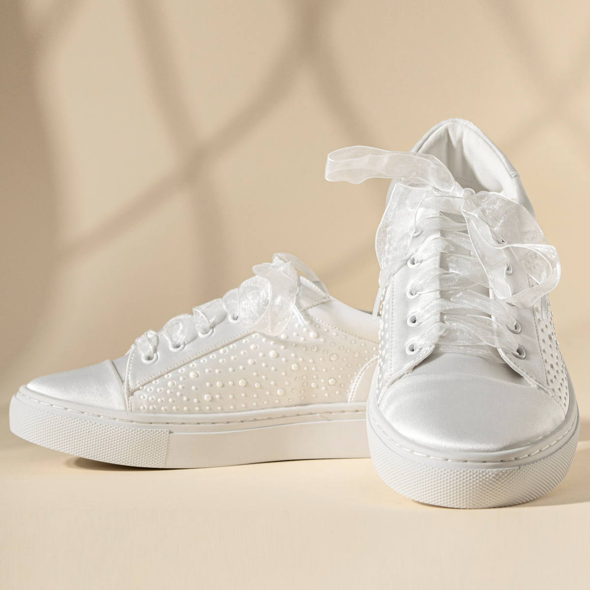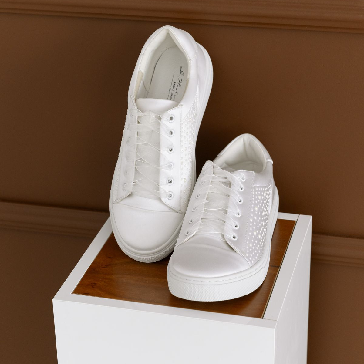Este o pereche de teniși de mireasă realizată din satin ivoire de înaltă calitate, decorată delicat cu perle aplicate pe laterale.