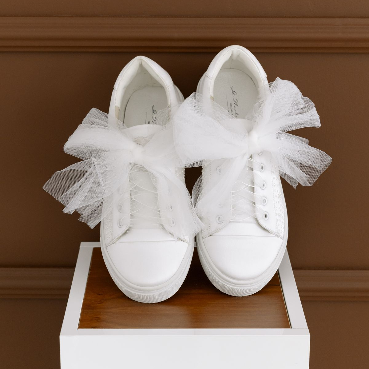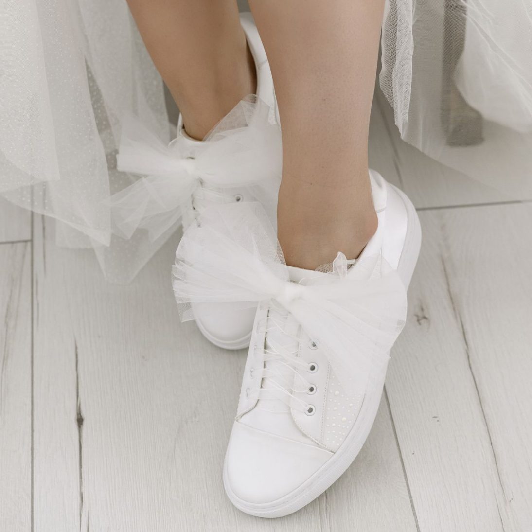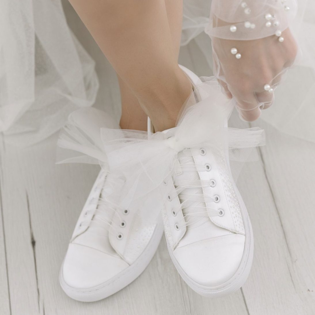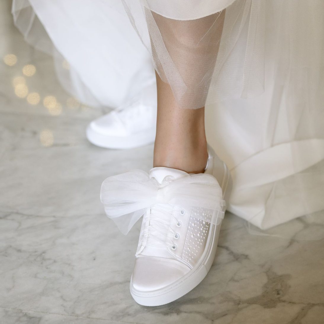 Este o pereche de teniși de mireasă realizată din satin ivoire de înaltă calitate, decorată delicat cu perle aplicate pe laterale.