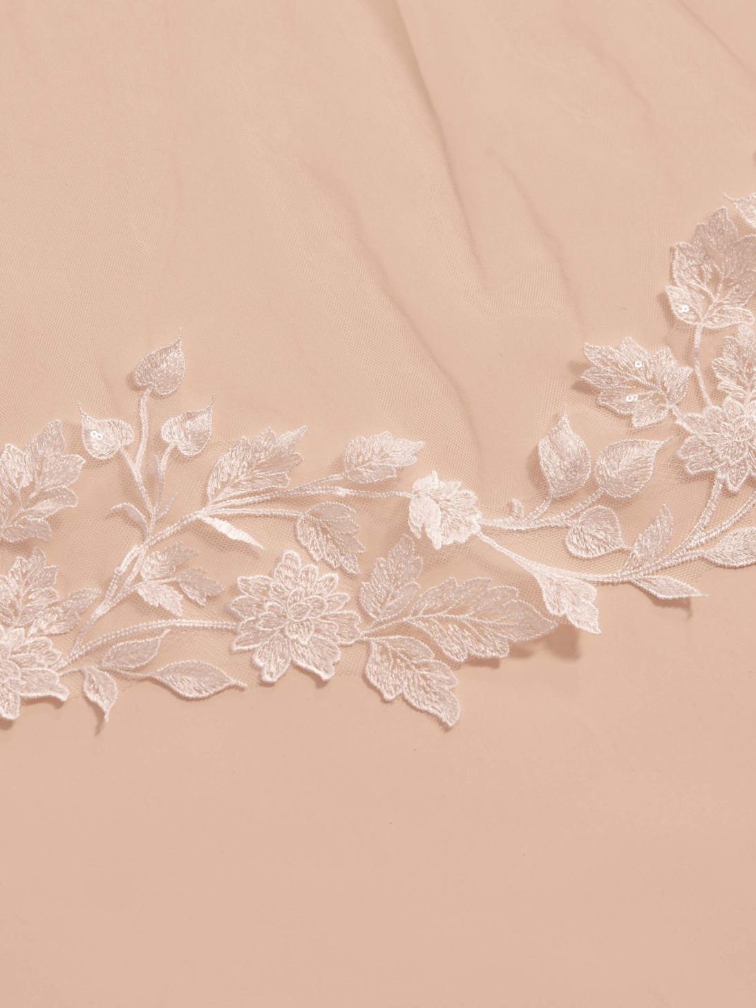 Descriere: Voal de mireasă stil capela într-un singur strat cu tiv din dantelă.