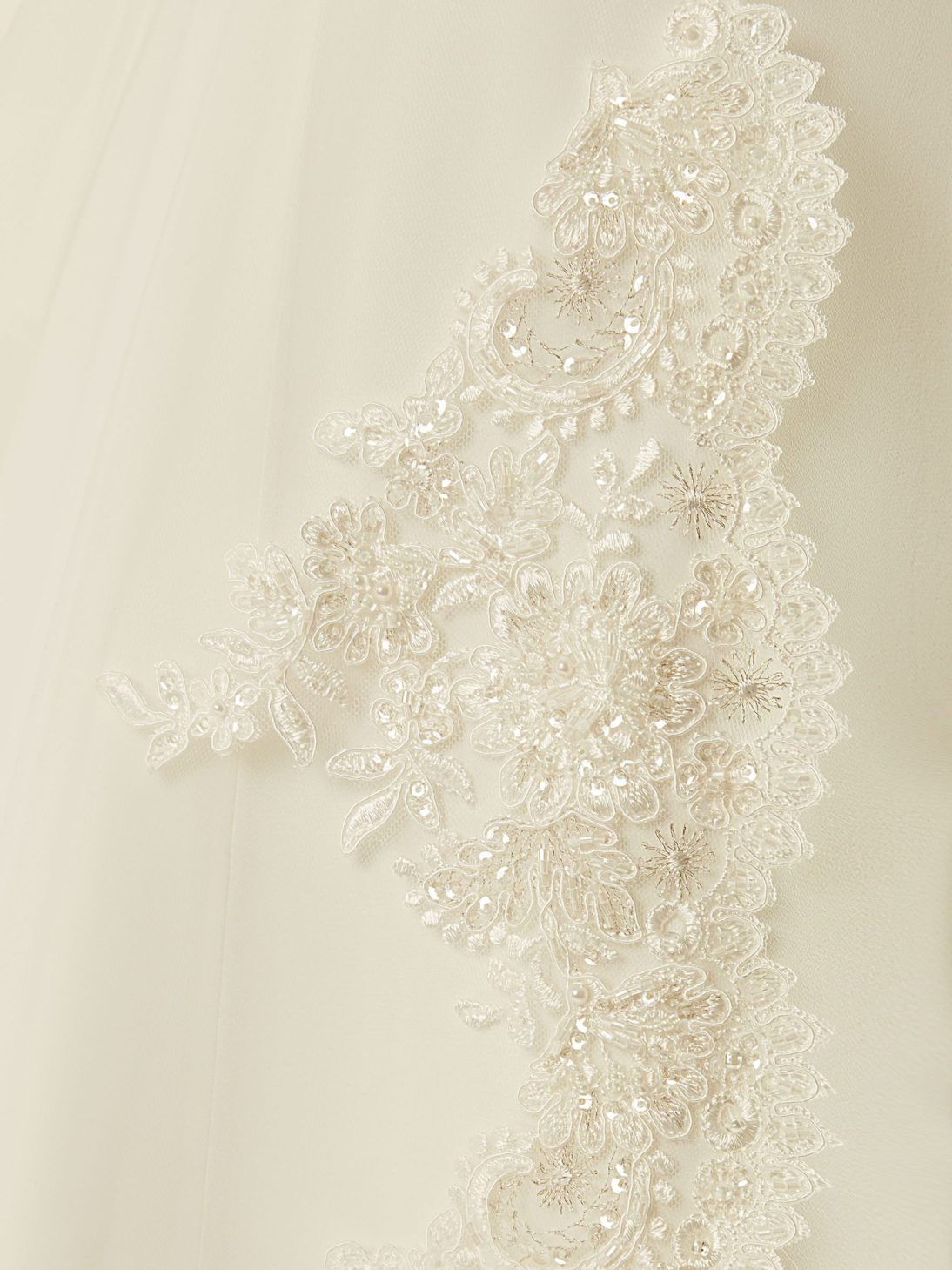 Descriere: Voal de mireasă într-un singur strat cu bordură din dantelă și aplicații cusute manual din paiete și mărgele.