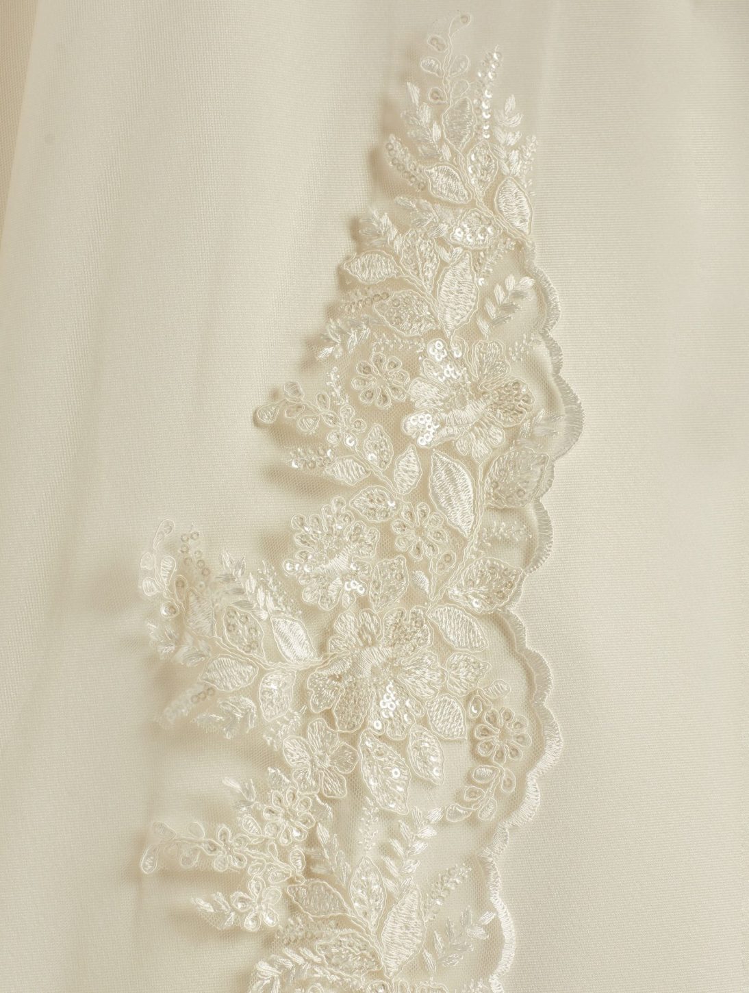 Descriere: Voal de mireasă într-un singur strat cu bordură din dantelă și paiete cusute manual.